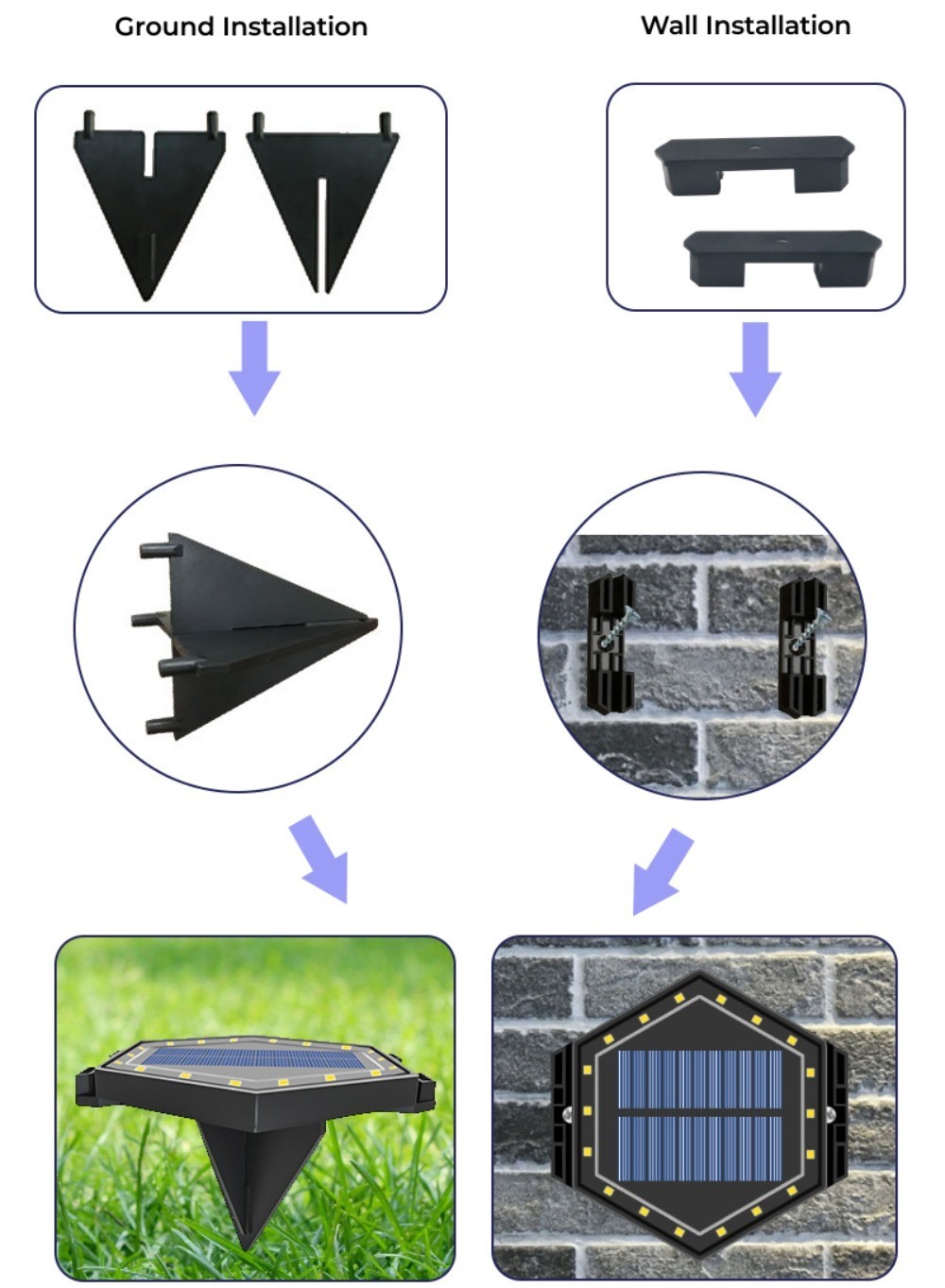 Предлагая универсальные варианты установки, эти огни могут быть встроены в землю для освещения пути и подъездной дороги или установлены на стенах и заборах, чтобы обеспечить повышенную видимость и безопасность. Благодаря беспроводной и без инструментов процесс установки, их легко настроить, не требуя сложной проводки. Независимо от того, хотите ли вы создать приветствующую атмосферу в своем саду или повысить безопасность вокруг вашего дома, эти подземные лампы с солнечным энергопотреблением обеспечивают надежное, энергоэффективное и без обслуживания наружного освещения.